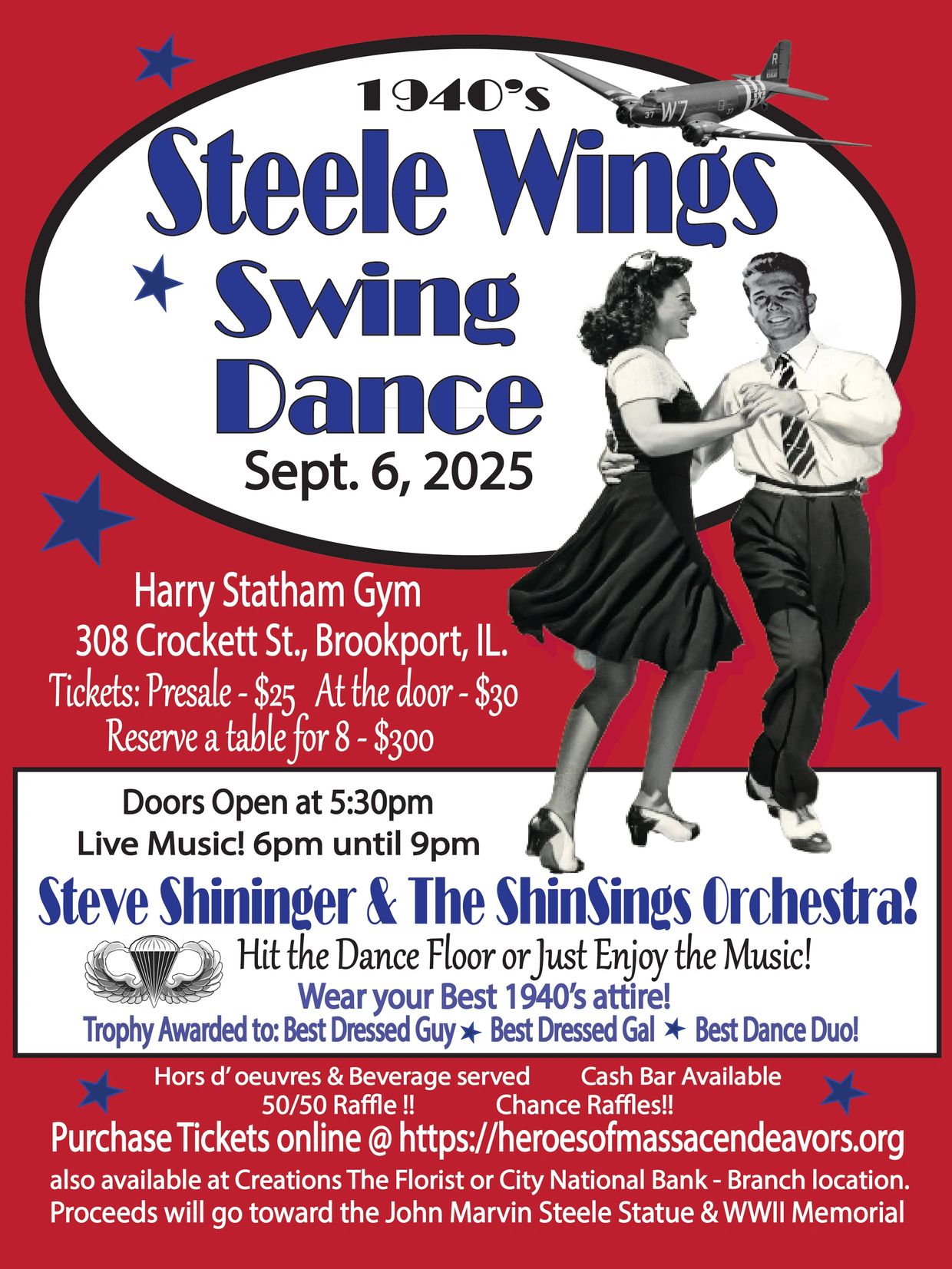 Whether you like to dance or just listen to big band music, this is an event you won't want to miss.  Join the fun in your finest 1940's costume and help raise funds for Heroes of Massac Endeavors first project, a statue honoring John Marvin Steele and World War II Memorial.